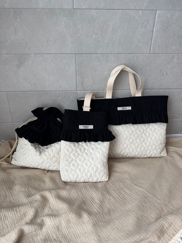 通園グッズ、通学グッズ 黒×ハートキルティング白 3点セット